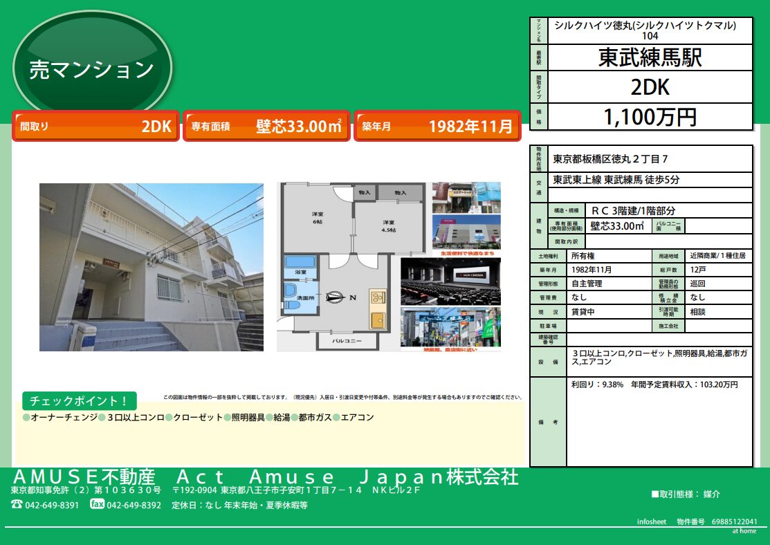 『利回り9.38%』東武練馬駅 至近の2DKマンション【東京23区・八王子多摩エリアの投資物件情報】