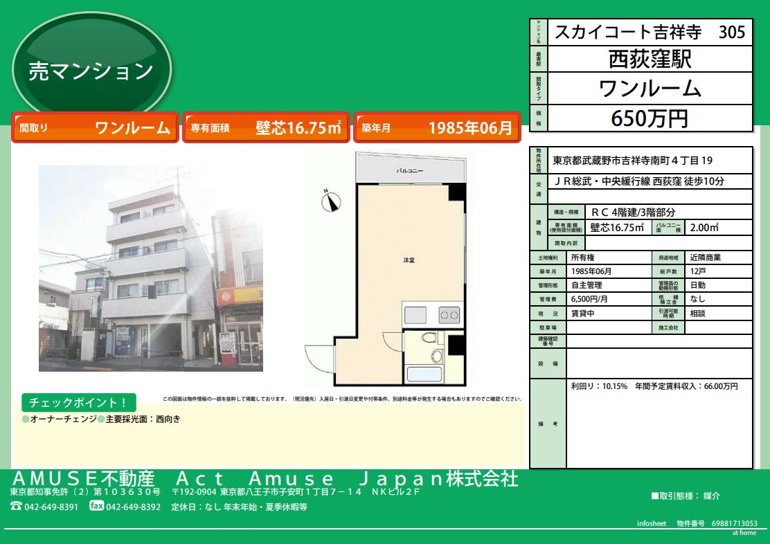 『利回り10.15%(表面)』JR総部・中央緩行線 西荻窪駅から徒歩10分のワンルームマンション『スカイコート吉祥寺』