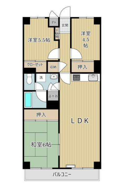 和室6帖、洋室5.5帖・4.5帖を備えた、ゆとりある間取り。広々としたLDKを中心に、各居室にはクローゼットや押し入れを完備しており、ご家族や同居人それぞれが自分の空間をしっかり確保できます。